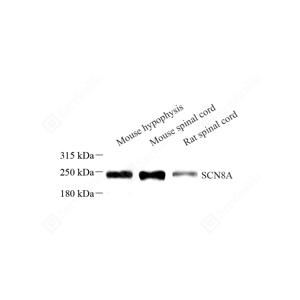 WB检测Nav1. 6/SCN8A蛋白(货号 GB113741). 样品: 经RIPA裂解液(货号G2002)处理的蛋白质. 封闭: 3%脱脂牛奶(货号GC310001)溶于TBST溶液, 室温孵育1小时. —抗: 1: 600稀释, 4℃ 孵育过夜. 二抗: HRP标记山羊抗兔IgG (H+L) (货号GB23303), 1: 5000稀释, 室温孵育1小时. |