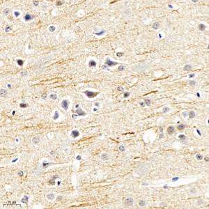 IHC检测Nav1. 6/SCN8A蛋白(货号 GB113741). 样品: 大鼠脑, 4%多聚甲醛 (货号G1101) 固定12-24小时. 抗原修复: 柠檬酸抗原修复液(干粉, pH 6.0) (G1201), 98℃, 20分钟. —抗: 1: 1800稀释, 4℃ 孵育过夜. 二抗: HRP标记山羊抗兔IgG (H+L) (货号GB23303), 1: 200稀释, 室温孵育1小时. |