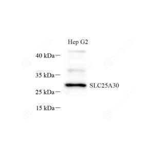 WB检测SLC25A30蛋白(货号 GB115264). 样品: 经RIPA裂解液(货号G2002)处理的蛋白质. 封闭: 封闭: 3%脱脂牛奶(货号GC310001)溶于TBST溶液, 室温孵育1小时. —抗: 1: 1000稀释, 4℃ 孵育过夜. 二抗: HRP标记山羊抗兔IgG (H+L) (货号GB23303), 1: 5000稀释, 室温孵育1小时. |