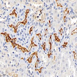 IHC检测SLC6A19蛋白(货号 GB112256). 样品: 小鼠肾, 4%多聚甲醛 (货号G1101) 固定12-24小时. 抗原修复: 柠檬酸抗原修复液(干粉, pH 6.0) (G1201), 98℃, 20分钟. —抗: 1: 450稀释, 4℃ 孵育过夜. 二抗: HRP标记山羊抗兔IgG (H+L) (货号GB23303), 1: 200稀释, 室温孵育1小时. |