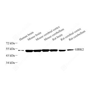 WB检测GIRK2蛋白(货号 GB11718). 样品: 经RIPA裂解液(货号G2002)处理的蛋白质. 封闭: 封闭: 3%脱脂牛奶(货号GC310001)溶于TBST溶液, 室温孵育1小时. —抗: 1: 500稀释, 4℃ 孵育过夜. 二抗: HRP标记山羊抗兔IgG (H+L) (货号GB23303), 1: 5000稀释, 室温孵育1小时. |
