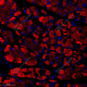 IF检测KCTD19蛋白(货号 GB112187)(红色). 样品: 人胃, 4%多聚甲醛 (货号G1101) 固定12-24小时. 抗原修复: Tris-EDTA抗原修复液(pH 9.0) (G1203), 98℃, 20分钟. 封闭: 3% BSA(货号GC305010)的PBS溶液, 室温孵育30分钟. —抗: 1: 500稀释, 4℃ 孵育过夜. 二抗: Cy3标记山羊抗兔IgG (H+L) (货号GB21303), 1: 300稀释, 室温孵育1小时. |