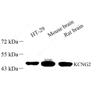 WB检测KCNG2蛋白(货号 GB112027). 样品: 经RIPA裂解液(货号G2002)处理的蛋白质. 封闭: 封闭: 3%脱脂牛奶(货号GC310001)溶于TBST溶液, 室温孵育1小时. —抗: 1: 500稀释, 4℃ 孵育过夜. 二抗: HRP标记山羊抗兔IgG (H+L) (货号GB23303), 1: 5000稀释, 室温孵育1小时. |