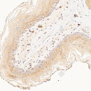 IHC检测KCNK7蛋白(货号 GB112725). 样品: 大鼠食管, 4%多聚甲醛 (货号G1101) 固定12-24小时. 抗原修复: 柠檬酸抗原修复液(干粉, pH 6.0) (G1201), 98℃, 20分钟. —抗: 1: 600稀释, 4℃ 孵育过夜. 二抗: HRP标记山羊抗兔IgG (H+L) (货号GB23303), 1: 200稀释, 室温孵育1小时. |