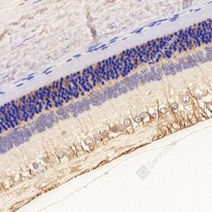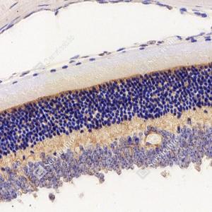 IHC检测KCNV2蛋白(货号 GB112798). 样品: 小鼠眼球, 4%多聚甲醛 (货号G1101) 固定12-24小时. 抗原修复: 柠檬酸抗原修复液(干粉, pH 6.0) (G1201), 98℃, 20分钟. —抗: 1: 2800稀释, 4℃ 孵育过夜. 二抗: HRP标记山羊抗兔IgG (H+L) (货号GB23303), 1: 200稀释, 室温孵育1小时. |