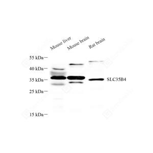WB检测SLC35B4蛋白(货号 GB115280). 样品: 经RIPA裂解液(货号G2002)处理的蛋白质. 封闭: 封闭: 3%脱脂牛奶(货号GC310001)溶于TBST溶液, 室温孵育1小时. —抗: 1: 1000稀释, 4℃ 孵育过夜. 二抗: HRP标记山羊抗兔IgG (H+L) (货号GB23303), 1: 5000稀释, 室温孵育1小时. |