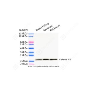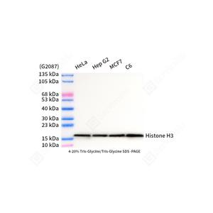 | WB检测Histone H3蛋白(货号 GB15102). 样品: 经RIPA裂解液(货号G2002)处理的蛋白质. 封闭: 3%脱脂牛奶(货号GC310001)溶于TBST溶液, 室温孵育1小时. —抗: 1: 2000稀释, 4℃ 孵育过夜. 二抗: HRP标记山羊抗兔IgG (H+L) (货号GB23303), 1: 5000稀释, 室温孵育1小时. |