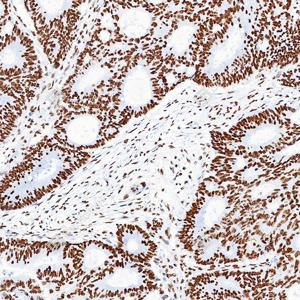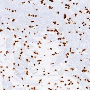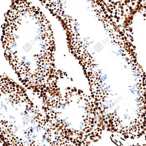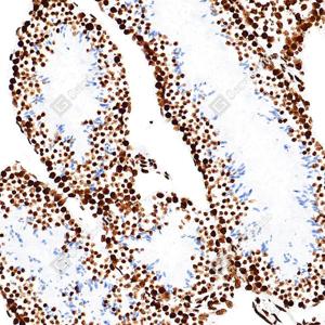 | IHC检测Histone H3蛋白(货号 GB15102). 样品: 人结肠癌, 4%多聚甲醛 (货号G1101) 固定12-24小时. 抗原修复: 抗原修复仪(货号 ARI-4),Tris-EDTA抗原修复液(pH 9.0) (货号G1203), 水浴100℃, 25分钟. —抗: 1: 1000稀释, 4℃ 孵育过夜. 二抗: S-vision免疫组化多聚二抗(山羊抗兔),即用型 (货号G1302), 室温孵育20分钟. |