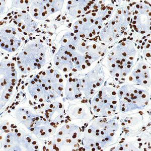 | IHC检测Histone H3蛋白(货号 GB15102). 样品: 小鼠睾丸, 4%多聚甲醛 (货号G1101) 固定12-24小时. 抗原修复: 抗原修复仪(货号 ARI-4),Tris-EDTA抗原修复液(pH 9.0) (货号G1203), 水浴100℃, 25分钟. —抗: 1: 500稀释, 4℃ 孵育过夜. 二抗: S-vision免疫组化多聚二抗(山羊抗兔),即用型 (货号G1302), 室温孵育20分钟. |