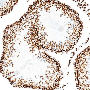 | IHC检测Histone H3蛋白(货号 GB15102). 样品: 大鼠睾丸, 4%多聚甲醛 (货号G1101) 固定12-24小时. 抗原修复: 抗原修复仪(货号 ARI-4),Tris-EDTA抗原修复液(pH 9.0) (货号G1203), 水浴100℃, 25分钟. —抗: 1: 500稀释, 4℃ 孵育过夜. 二抗: S-vision免疫组化多聚二抗(山羊抗兔),即用型 (货号G1302), 室温孵育20分钟. |