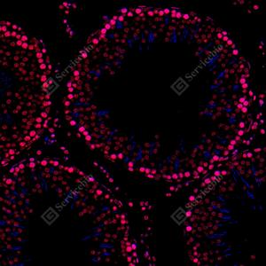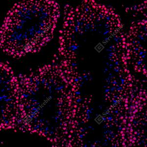 | IF检测Histone H3蛋白(货号 GB15102)(红色). 样品: 大鼠睾丸, 4%多聚甲醛 (货号G1101) 固定12-24小时. 抗原修复: 抗原修复仪(货号 ARI-4),Tris-EDTA抗原修复液(pH 9.0) (货号G1203), 水浴100℃, 25分钟. 封闭: 3% BSA(货号GC305010)的PBS溶液, 室温孵育30分钟. —抗: 1: 500稀释, 4℃ 孵育过夜. 二抗: Cy3标记山羊抗兔IgG (H+L) (货号GB21303), 1: 300稀释, 室温孵育1小时. |
