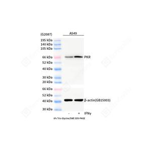| WB检测PKR蛋白(货号 GB151096). 样品: 经RIPA裂解液(货号G2002)处理的蛋白质. 封闭: 3%脱脂牛奶(货号GC310001)溶于TBST溶液, 室温孵育1小时. —抗: 1: 500稀释, 4℃ 孵育过夜. 二抗: HRP标记山羊抗兔IgG (H+L) (货号GB23303), 1: 5000稀释, 室温孵育1小时. |