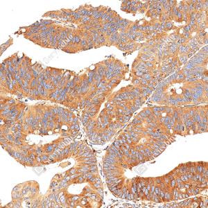 | IHC检测PKR蛋白(货号 GB151096). 样品: 人结肠癌, 4%多聚甲醛 (货号G1101) 固定12-24小时. 抗原修复: 抗原修复仪(货号 ARI-4),Tris-EDTA抗原修复液(pH 9.0) (货号G1203), 水浴100℃, 25分钟. —抗: 1: 2000稀释, 4℃ 孵育过夜. 二抗: S-vision免疫组化多聚二抗(山羊抗兔),即用型 (货号G1302), 室温孵育20分钟. |