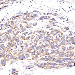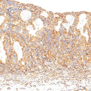 | IHC检测PKR蛋白(货号 GB151096). 样品: 人卵巢癌, 4%多聚甲醛 (货号G1101) 固定12-24小时. 抗原修复: 抗原修复仪(货号 ARI-4),Tris-EDTA抗原修复液(pH 9.0) (货号G1203), 水浴100℃, 25分钟. —抗: 1: 2000稀释, 4℃ 孵育过夜. 二抗: S-vision免疫组化多聚二抗(山羊抗兔),即用型 (货号G1302), 室温孵育20分钟. |