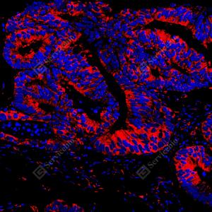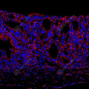 | IF检测PKR蛋白(货号 GB151096)(红色). 样品: 人结肠癌, 4%多聚甲醛 (货号G1101) 固定12-24小时. 抗原修复: 抗原修复仪(货号 ARI-4),Tris-EDTA抗原修复液(pH 9.0) (货号G1203), 水浴100℃, 25分钟. 封闭: 3% BSA(货号GC305010)的PBS溶液, 室温孵育30分钟. —抗: 1: 2000稀释, 4℃ 孵育过夜. 二抗: Cy3标记山羊抗兔IgG (H+L) (货号GB21303), 1: 300稀释, 室温孵育1小时. |