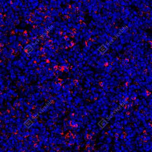 | IF检测PKR蛋白(货号 GB151096)(红色). 样品: 人扁桃体, 4%多聚甲醛 (货号G1101) 固定12-24小时. 抗原修复: 抗原修复仪(货号 ARI-4),Tris-EDTA抗原修复液(pH 9.0) (货号G1203), 水浴100℃, 25分钟. 封闭: 3% BSA(货号GC305010)的PBS溶液, 室温孵育30分钟. —抗: 1: 2000稀释, 4℃ 孵育过夜. 二抗: Cy3标记山羊抗兔IgG (H+L) (货号GB21303), 1: 300稀释, 室温孵育1小时. |