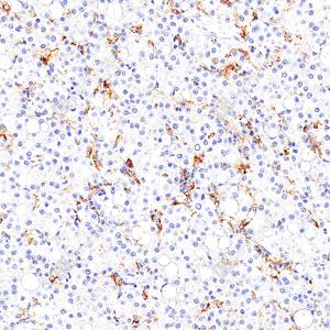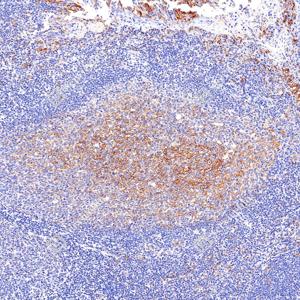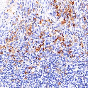 | IHC检测CD14蛋白(货号 GB15254). 样品: 人扁桃体, 4%多聚甲醛 (货号G1101) 固定12-24小时. 抗原修复: 抗原修复仪(货号 ARI-4),Tris-EDTA抗原修复液(pH 9.0) (货号G1203), 水浴100℃, 25分钟. —抗: 1: 500稀释, 4℃ 孵育过夜. 二抗: S-vision免疫组化多聚二抗(山羊抗小鼠), 即用型(货号G1301), 室温孵育20分钟. |