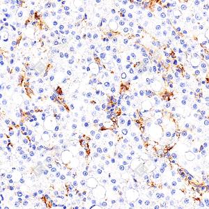 | IHC检测CD14蛋白(货号 GB15254). 样品: 人肝癌, 4%多聚甲醛 (货号G1101) 固定12-24小时. 抗原修复: 抗原修复仪(货号 ARI-4),Tris-EDTA抗原修复液(pH 9.0) (货号G1203), 水浴100℃, 25分钟. —抗: 1: 500稀释, 4℃ 孵育过夜. 二抗: S-vision免疫组化多聚二抗(山羊抗小鼠), 即用型(货号G1301), 室温孵育20分钟. |