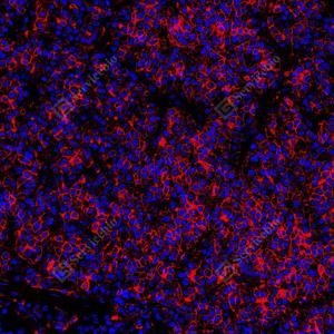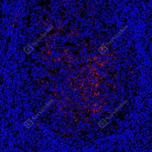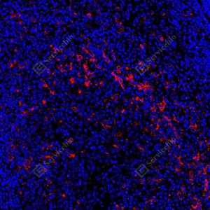 | IF检测CD14蛋白(货号 GB15254)(红色). 样品: 人扁桃体, 4%多聚甲醛 (货号G1101) 固定12-24小时. 抗原修复: 抗原修复仪(货号 ARI-4),Tris-EDTA抗原修复液(pH 9.0) (货号G1203), 水浴100℃, 25分钟. 封闭: 3% BSA(货号GC305010)的PBS溶液, 室温孵育30分钟. —抗: 1: 500稀释, 4℃ 孵育过夜. 二抗: Cy3标记山羊抗小鼠IgG (H+L) (货号GB21301), 1: 300稀释, 室温孵育1小时. |