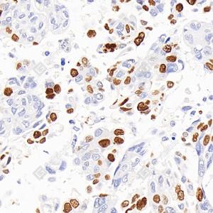 IHC检测Ki67蛋白(货号 GB121499). 样品: 人卵巢癌, 4%多聚甲醛 (货号G1101) 固定12-24小时. 抗原修复: 柠檬酸抗原修复液(干粉, pH 6.0) (G1201), 高压锅均匀喷气计时2分钟. —抗: 1: 500稀释, 4℃ 孵育过夜. 二抗: HRP标记山羊抗小鼠IgG (H+L) (货号GB23301), 1: 200稀释, 室温孵育1小时. |