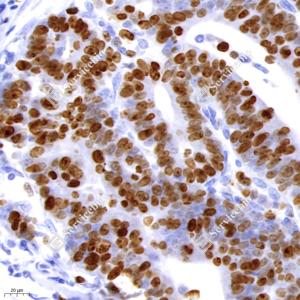 IHC检测Ki67蛋白(货号 GB121499). 样品: 人结直肠癌, 4%多聚甲醛 (货号G1101) 固定12-24小时. 抗原修复: 柠檬酸抗原修复液(干粉, pH 6.0) (G1201), 高压锅均匀喷气计时2分钟. —抗: 1: 500稀释, 4℃ 孵育过夜. 二抗: HRP标记山羊抗小鼠IgG (H+L) (货号GB23301), 1: 200稀释, 室温孵育1小时. |