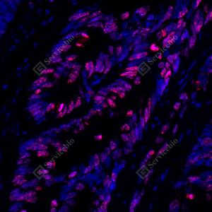 IF检测Ki67蛋白(货号 GB121499)(红色). 样品: 人结肠癌, 4%多聚甲醛 (货号G1101) 固定12-24小时. 抗原修复: 柠檬酸抗原修复液(干粉, pH 6.0) (G1201), 高压锅均匀喷气计时2分钟. 封闭: 3% BSA(货号GC305010)的PBS溶液, 室温孵育30分钟. —抗: 1: 500稀释, 4℃ 孵育过夜. 二抗: Cy3标记山羊抗小鼠IgG (H+L) (货号GB21301), 1: 300稀释, 室温孵育1小时. |