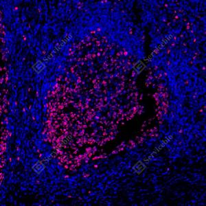 IF检测Ki67蛋白(货号 GB121499)(红色). 样品: 人扁桃体, 4%多聚甲醛 (货号G1101) 固定12-24小时. 抗原修复: 柠檬酸抗原修复液(干粉, pH 6.0) (G1201), 高压锅均匀喷气计时2分钟. 封闭: 3% BSA(货号GC305010)的PBS溶液, 室温孵育30分钟. —抗: 1: 500稀释, 4℃ 孵育过夜. 二抗: Cy3标记山羊抗小鼠IgG (H+L) (货号GB21301), 1: 300稀释, 室温孵育1小时. |