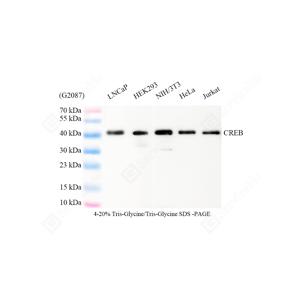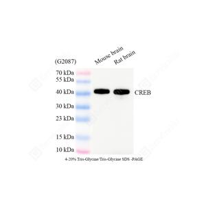| WB检测CREB蛋白(货号 GB15236). 样品: 经RIPA裂解液(货号G2002)处理的蛋白质. 封闭: 3%脱脂牛奶(货号GC310001)溶于TBST溶液, 室温孵育1小时. —抗: 1: 1000稀释, 4℃ 孵育过夜. 二抗: HRP标记山羊抗小鼠IgG (H+L) (货号GB23301), 1: 5000稀释, 室温孵育1小时. |