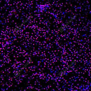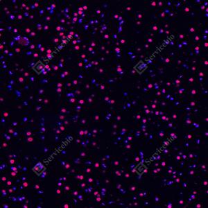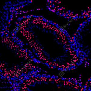 | IF检测CREB蛋白(货号 GB15236)(红色). 样品: 大鼠睾丸, 4%多聚甲醛 (货号G1101) 固定12-24小时. 抗原修复: 抗原修复仪 (货号 ARI-4),Tris-EDTA抗原修复液(pH 9.0) (货号G1203), 水浴100℃, 25分钟. 封闭: 3% BSA(货号GC305010)的PBS溶液, 室温孵育30分钟. —抗: 1: 1500稀释, 4℃ 孵育过夜. 二抗: Cy3标记山羊抗小鼠IgG (H+L) (货号GB21301), 1: 300稀释, 室温孵育1小时. |