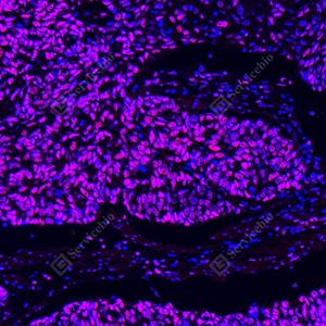 | IF检测CREB蛋白(货号 GB15236)(红色). 样品: 人食管癌, 4%多聚甲醛 (货号G1101) 固定12-24小时. 抗原修复: 抗原修复仪 (货号 ARI-4),Tris-EDTA抗原修复液(pH 9.0) (货号G1203), 水浴100℃, 25分钟. 封闭: 3% BSA(货号GC305010)的PBS溶液, 室温孵育30分钟. —抗: 1: 1500稀释, 4℃ 孵育过夜. 二抗: Cy3标记山羊抗小鼠IgG (H+L) (货号GB21301), 1: 300稀释, 室温孵育1小时. |