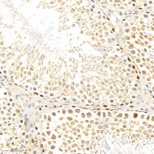 IHC检测Cyclin B1蛋白(货号 GB11255). 样品: 大鼠睾丸, 4%多聚甲醛 (货号G1101) 固定12-24小时. 抗原修复: 柠檬酸抗原修复液(干粉, pH 6.0) (G1201), 98℃, 20分钟. —抗: 1: 400稀释, 4℃ 孵育过夜. 二抗: HRP标记山羊抗兔IgG (H+L) (货号GB23303), 1: 200稀释, 室温孵育1小时. |
