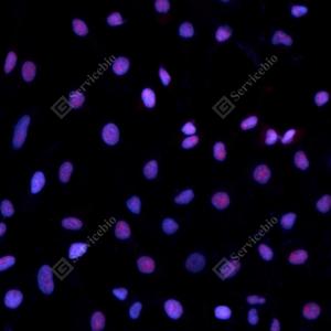 ICC检测Rad51蛋白(货号 GB11572)(红色). 样品: HeLa细胞, 4%多聚甲醛 (货号G1101) 固定20分钟. 封闭: 3% BSA(货号GC305010)的PBS溶液, 室温孵育30分钟. 一抗: 1: 200稀释, 4℃ 孵育过夜. 二抗: Cy3标记山羊抗兔IgG (H+L) (货号GB21303), 1: 300稀释, 室温孵育1小时. |