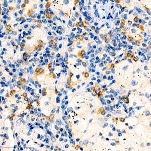 | IHC检测p70 S6 Kinase蛋白(货号 GB111181). 样品: 人肺癌, 4%多聚甲醛 (货号G1101) 固定12-24小时. 抗原修复: 柠檬酸抗原修复液(干粉, pH 6.0) (G1201), 98℃, 20分钟. —抗: 1: 600稀释, 4℃ 孵育过夜. 二抗: HRP标记山羊抗兔IgG (H+L) (货号GB23303), 1: 200稀释, 室温孵育1小时. |