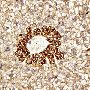 | IHC检测p70 S6 Kinase蛋白(货号 GB11298A). 样品: 小鼠肝, 4%多聚甲醛 (货号G1101) 固定12-24小时. 抗原修复: 柠檬酸抗原修复液(干粉, pH 6.0) (G1201), 98℃, 20分钟. —抗: 1: 500稀释, 4℃ 孵育过夜. 二抗: HRP标记山羊抗兔IgG (H+L) (货号GB23303), 1: 200稀释, 室温孵育1小时. |