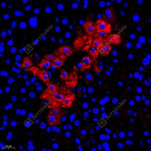 | IF检测p70 S6 Kinase蛋白(货号 GB11298A)(红色). 样品: 小鼠肝, 4%多聚甲醛 (货号G1101) 固定12-24小时. 抗原修复: Tris-EDTA抗原修复液(pH 9.0) (G1203), 98℃, 20分钟. 封闭: 3% BSA(货号GC305010)的PBS溶液, 室温孵育30分钟. —抗: 1: 500稀释, 4℃ 孵育过夜. 二抗: Cy3标记山羊抗兔IgG (H+L) (货号GB21303), 1: 300稀释, 室温孵育1小时. |