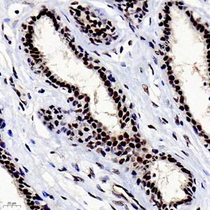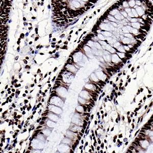 IHC检测p27 KIP 1蛋白(货号 GB11517). 样品: 人结肠, 4%多聚甲醛 (货号G1101) 固定12-24小时. 抗原修复: 柠檬酸抗原修复液(干粉, pH 6.0) (G1201), 98℃, 20分钟. —抗: 1: 500稀释, 4℃ 孵育过夜. 二抗: HRP标记山羊抗兔IgG (H+L) (货号GB23303), 1: 200稀释, 室温孵育1小时. |