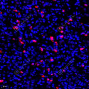 IF检测p27 KIP 1蛋白(货号 GB11517)(红色). 样品: 人肾, 4%多聚甲醛 (货号G1101) 固定12-24小时. 抗原修复: Tris-EDTA抗原修复液(pH 9.0) (G1203), 98℃, 20分钟. 封闭: 3% BSA(货号GC305010)的PBS溶液, 室温孵育30分钟. —抗: 1: 500稀释, 4℃ 孵育过夜. 二抗: Cy3标记山羊抗兔IgG (H+L) (货号GB21303), 1: 300稀释, 室温孵育1小时. |
