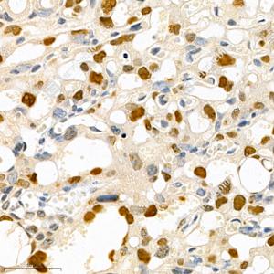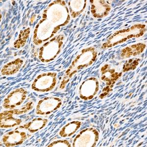 IHC检测Cyclin A2蛋白(货号 GB111228). 样品: 小鼠子宫, 4%多聚甲醛 (货号G1101) 固定12-24小时. 抗原修复: 柠檬酸抗原修复液(干粉, pH 6.0) (G1201), 98℃, 20分钟. —抗: 1: 800稀释, 4℃ 孵育过夜. 二抗: HRP标记山羊抗兔IgG (H+L) (货号GB23303), 1: 200稀释, 室温孵育1小时. |