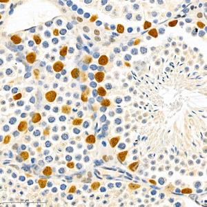 IHC检测Cyclin A2蛋白(货号 GB111228). 样品: 小鼠睾丸, 4%多聚甲醛 (货号G1101) 固定12-24小时. 抗原修复: 柠檬酸抗原修复液(干粉, pH 6.0) (G1201), 98℃, 20分钟. —抗: 1: 800稀释, 4℃ 孵育过夜. 二抗: HRP标记山羊抗兔IgG (H+L) (货号GB23303), 1: 200稀释, 室温孵育1小时. |