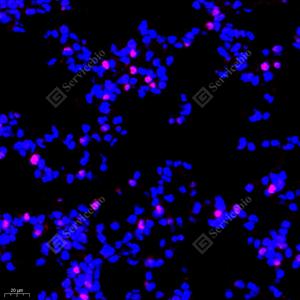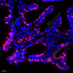 IF检测Cyclin A2蛋白(货号 GB111228)(红色). 样品: 小鼠肺, 4%多聚甲醛 (货号G1101) 固定12-24小时. 抗原修复: Tris-EDTA抗原修复液(pH 9.0) (G1203), 98℃, 20分钟. 封闭: 3% BSA(货号GC305010)的PBS溶液, 室温孵育30分钟. —抗: 1: 800稀释, 4℃ 孵育过夜. 二抗: Cy3标记山羊抗兔IgG (H+L) (货号GB21303), 1: 300稀释, 室温孵育1小时. |