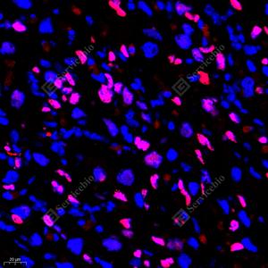 IF检测Cyclin A2蛋白(货号 GB111228)(红色). 样品: 小鼠卵巢, 4%多聚甲醛 (货号G1101) 固定12-24小时. 抗原修复: Tris-EDTA抗原修复液(pH 9.0) (G1203), 98℃, 20分钟. 封闭: 3% BSA(货号GC305010)的PBS溶液, 室温孵育30分钟. —抗: 1: 800稀释, 4℃ 孵育过夜. 二抗: Cy3标记山羊抗兔IgG (H+L) (货号GB21303), 1: 300稀释, 室温孵育1小时. |