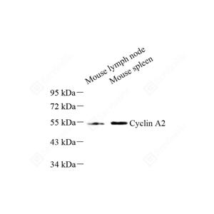 WB检测Cyclin A2蛋白(货号 GB111132). 样品: 经RIPA裂解液(货号G2002)处理的蛋白质. 封闭: 3%脱脂牛奶(货号GC310001)溶于TBST溶液, 室温孵育1小时. —抗: 1: 1000稀释, 4℃ 孵育过夜. 二抗: HRP标记山羊抗兔IgG (H+L) (货号GB23303), 1: 5000稀释, 室温孵育1小时. |