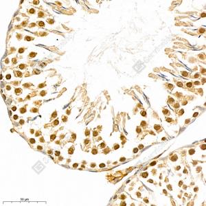IHC检测Cyclin A2蛋白(货号 GB111132). 样品: 大鼠睾丸, 4%多聚甲醛 (货号G1101) 固定12-24小时. 抗原修复: 柠檬酸抗原修复液(干粉, pH 6.0) (G1201), 98℃, 20分钟. —抗: 1: 600稀释, 4℃ 孵育过夜. 二抗: HRP标记山羊抗兔IgG (H+L) (货号GB23303), 1: 200稀释, 室温孵育1小时. |