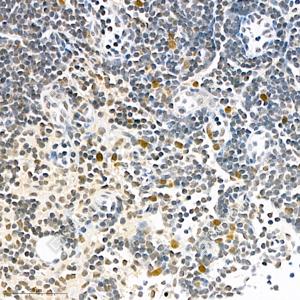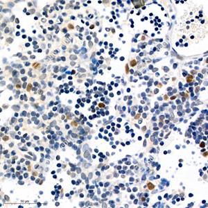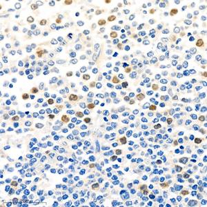 IHC检测Cyclin A2蛋白(货号 GB111132). 样品: 小鼠淋巴, 4%多聚甲醛 (货号G1101) 固定12-24小时. 抗原修复: 柠檬酸抗原修复液(干粉, pH 6.0) (G1201), 98℃, 20分钟. —抗: 1: 600稀释, 4℃ 孵育过夜. 二抗: HRP标记山羊抗兔IgG (H+L) (货号GB23303), 1: 200稀释, 室温孵育1小时. |