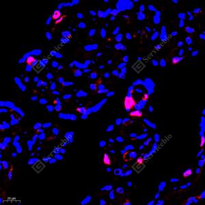 IF检测Cyclin A2蛋白(货号 GB111132)(红色). 样品: 小鼠胎盘, 4%多聚甲醛 (货号G1101) 固定12-24小时. 抗原修复: Tris-EDTA抗原修复液(pH 9.0) (G1203), 98℃, 20分钟. 封闭: 3% BSA(货号GC305010)的PBS溶液, 室温孵育30分钟. —抗: 1: 500稀释, 4℃ 孵育过夜. 二抗: Cy3标记山羊抗兔IgG (H+L) (货号GB21303), 1: 300稀释, 室温孵育1小时. |