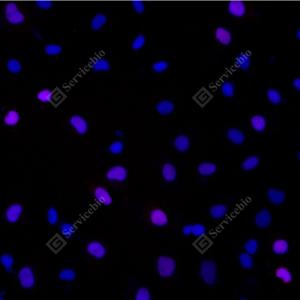 ICC检测Cyclin A2蛋白(货号 GB111132)(红色). 样品: HeLa细胞, 4%多聚甲醛 (货号G1101) 固定20分钟. 封闭: 3% BSA(货号GC305010)的PBS溶液, 室温孵育30分钟. 一抗: 1: 200稀释, 4℃ 孵育过夜. 二抗: Cy3标记山羊抗兔IgG (H+L) (货号GB21303), 1: 300稀释, 室温孵育1小时. |