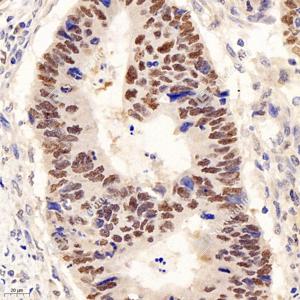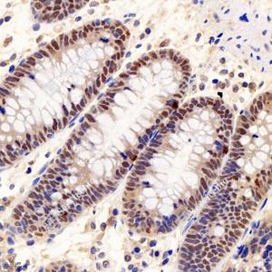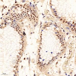 IHC检测Chk2蛋白(货号 GB12575). 样品: 人结肠, 4%多聚甲醛 (货号G1101) 固定12-24小时. 抗原修复: Tris-EDTA抗原修复液(pH 9.0) (G1203), 98℃, 25分钟. —抗: 1: 500稀释, 4℃ 孵育过夜. 二抗: HRP标记山羊抗小鼠IgG (H+L) (货号GB23301), 1: 200稀释, 室温孵育1小时. |