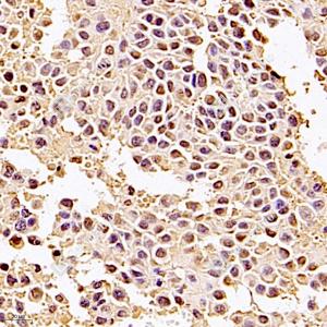 IHC检测ROR alpha/RORA蛋白(货号 GB121300). 样品: 人黑色素瘤, 4%多聚甲醛 (货号G1101) 固定12-24小时. 抗原修复: 柠檬酸抗原修复液(干粉, pH 6.0) (G1201), 高压锅均匀喷气计时2分钟. —抗: 1: 900稀释, 4℃ 孵育过夜. 二抗: HRP标记山羊抗小鼠IgG (H+L) (货号GB23301), 1: 200稀释, 室温孵育1小时. |