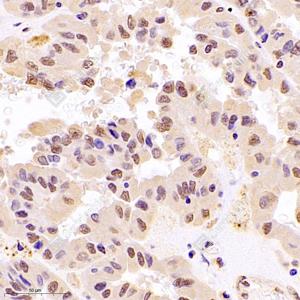 IHC检测ROR alpha/RORA蛋白(货号 GB121300). 样品: 人肾癌, 4%多聚甲醛 (货号G1101) 固定12-24小时. 抗原修复: 柠檬酸抗原修复液(干粉, pH 6.0) (G1201), 高压锅均匀喷气计时2分钟. —抗: 1: 900稀释, 4℃ 孵育过夜. 二抗: HRP标记山羊抗小鼠IgG (H+L) (货号GB23301), 1: 200稀释, 室温孵育1小时. |