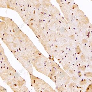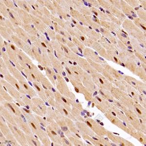IHC检测ROR alpha/RORA蛋白(货号 GB121300). 样品: 小鼠心, 4%多聚甲醛 (货号G1101) 固定12-24小时. 抗原修复: 柠檬酸抗原修复液(干粉, pH 6.0) (G1201), 高压锅均匀喷气计时2分钟. —抗: 1: 900稀释, 4℃ 孵育过夜. 二抗: HRP标记山羊抗小鼠IgG (H+L) (货号GB23301), 1: 200稀释, 室温孵育1小时. |